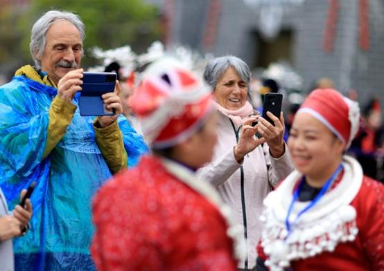 4月12日,外国游客在贵州省黔东南苗族侗族自治州台江县举行的“苗族姊妹节”庆祝活动上拍摄。新华社记者刘续 摄