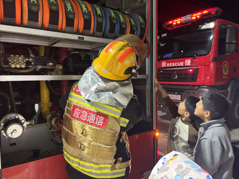 演习尾声,消防员结合夜间火灾特点,为福利院工作人员和儿童带来了一堂生动的消防安全实操课。消防员现场讲解了消防车的构造、各类消防器材的用途,并邀请工作人员、儿童近距离体验操作。针对儿童认知特点,消防员用通俗易懂的语言普及了火灾预防常识、夜间逃生注意事项,解答了孩子们关于消防安全的疑问,让消防知识深植童心。